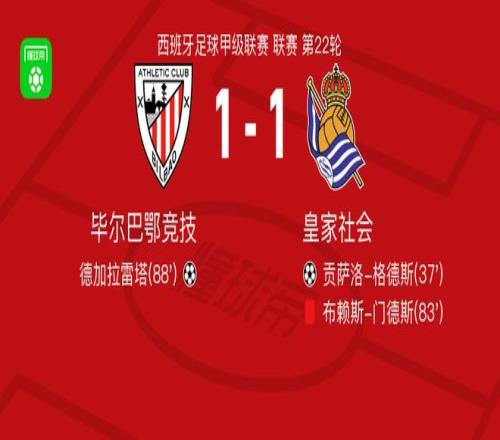 北京时间2月2日西班牙足球甲级联赛 联赛 第22轮,毕尔巴鄂竞技主场对阵皇家社会。毕尔巴鄂竞技德加拉雷塔破门。皇家社会贡萨洛-格德斯破门。最终比分毕尔巴鄂竞技 1-1 皇家社会。